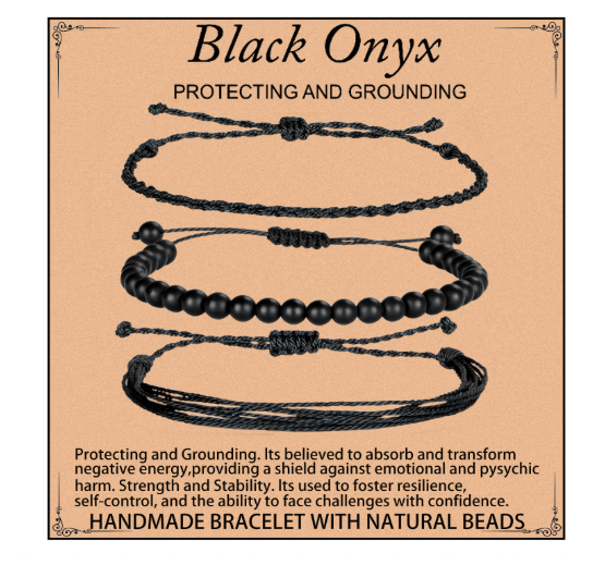 1 pc natural size adjustable black onyx bracelet, 2 pcs size adjustable rope bracelets, 1 pc greeting card, 1 pc jewelry bag. All bracelets are handmade, all stone beads are carefully selected and made into bracelets.
