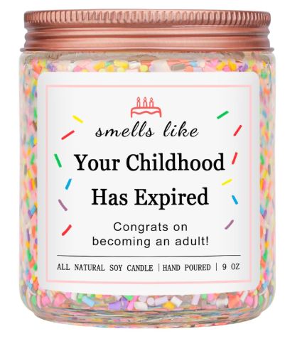 Perfect 18th Birthday Gifts for Girls or Boys: This candle is 3 inches wide x 4 inches high, with the words ‘Your Childhood Has Expired Congrats on becoming an adult! ‘Written on it. It is a unique and thoughtful gift to girls or boys, symbolizing a surprise for an 18th birthday.