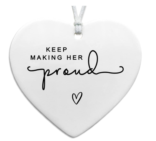 The “Keep Making Her Proud” ceramic heart keepsake is a meaningful and versatile gift crafted from high quality white ceramic material.