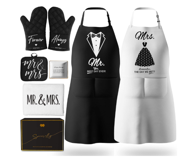 MR AND MRS APRONS FOR COUPLES GIFTS – Apron gift sets contains the functional oven mitts, jewelry tray, dish towel & the couples aprons. Husband and wife apron set are printed with MR MRS. These durable aprons have an adjustable neck and waist sizes. Never have to worry about what size to wear. This apron couple gift will definitely put a smile on their face and it also become an important factor on their happy daily life